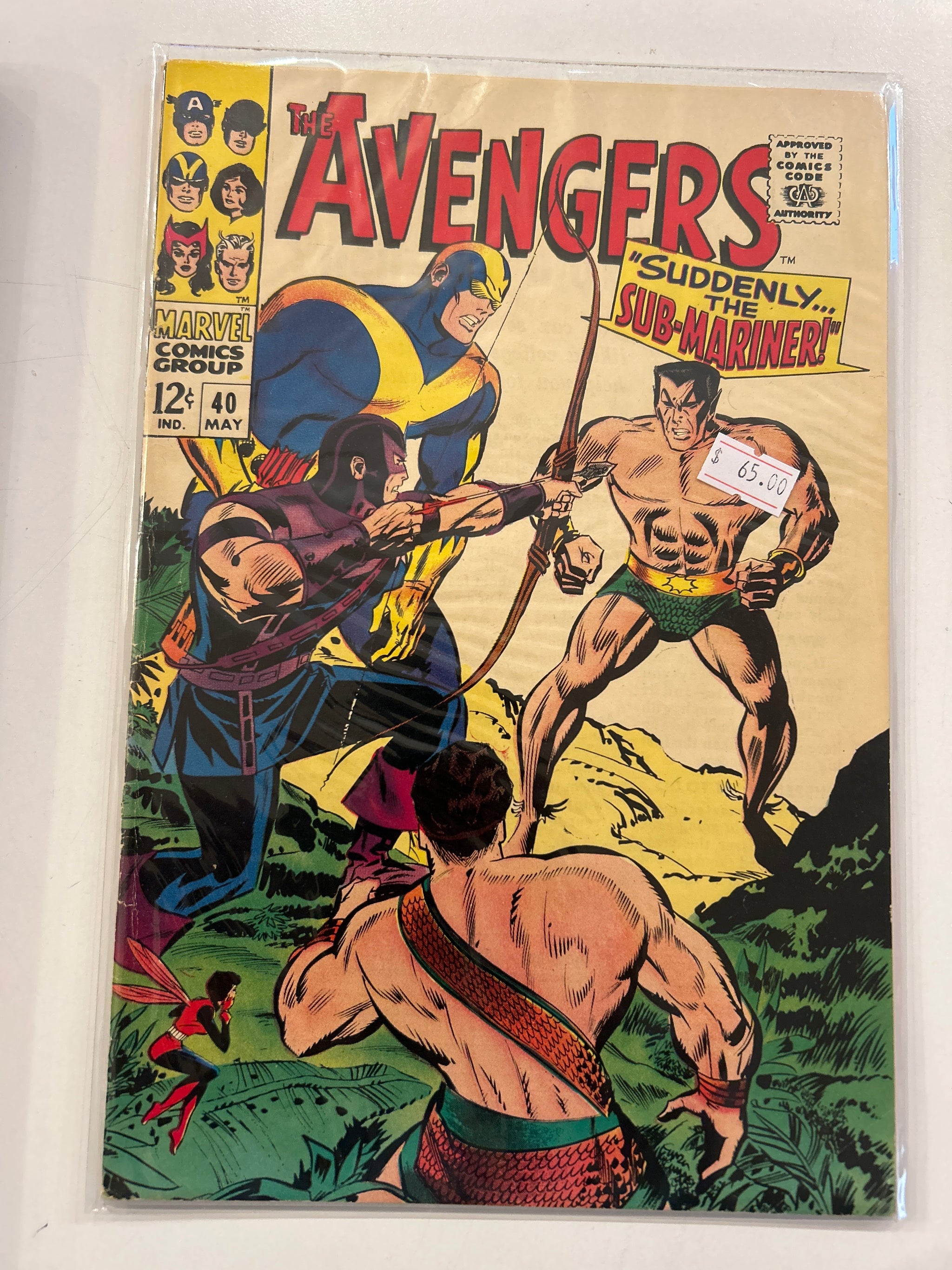 "Suddenly ... the Sub-Mariner!"– (20-page story) – The Scarlet Witch collapses after the battle in the previous issue. Black Widow steals an experimental jet from General Ross. Meanwhile, the Sub-Mariner...